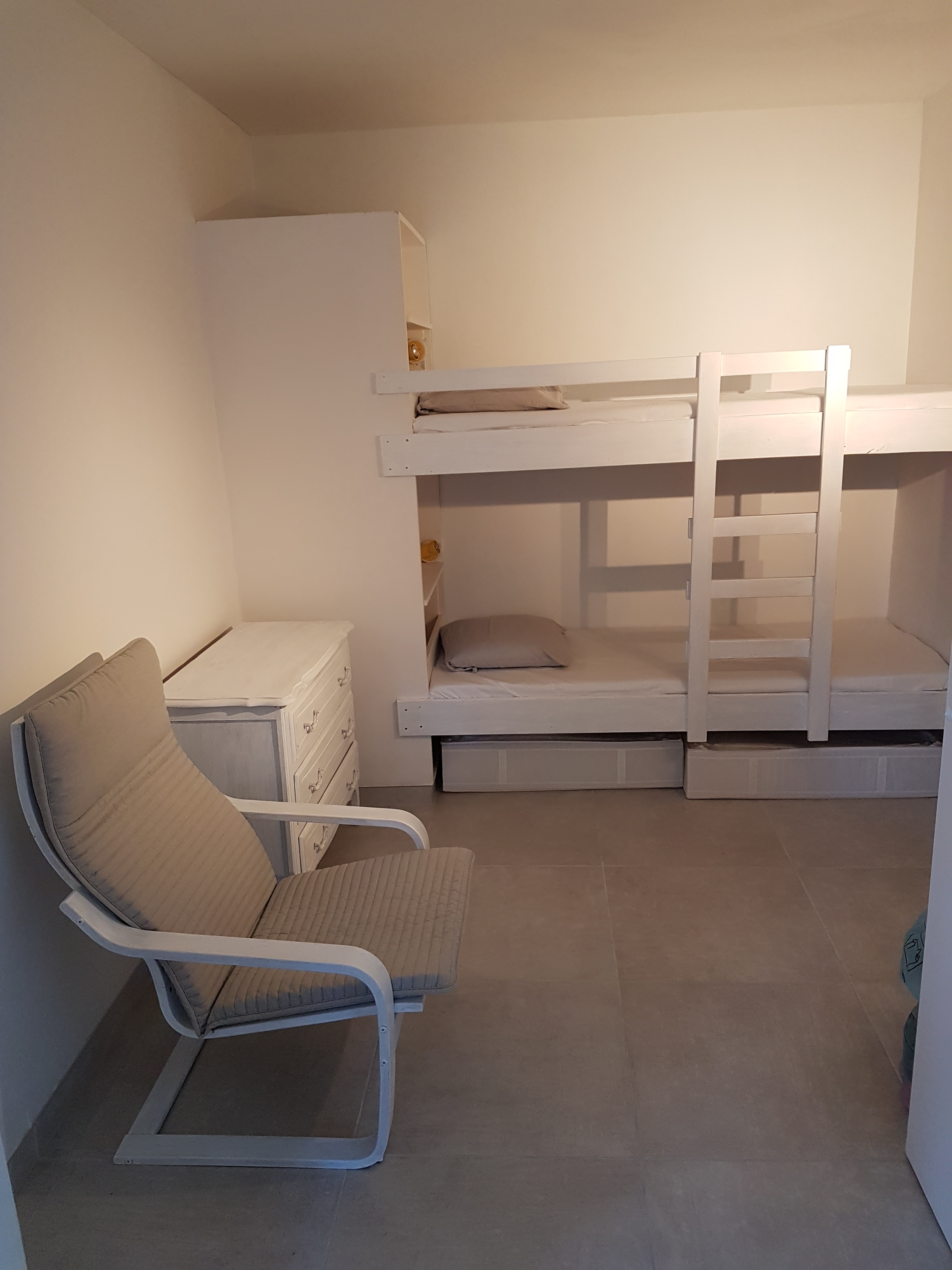 - Un espace avec 2 lits superposés en 80×190 et coffres de rangement.