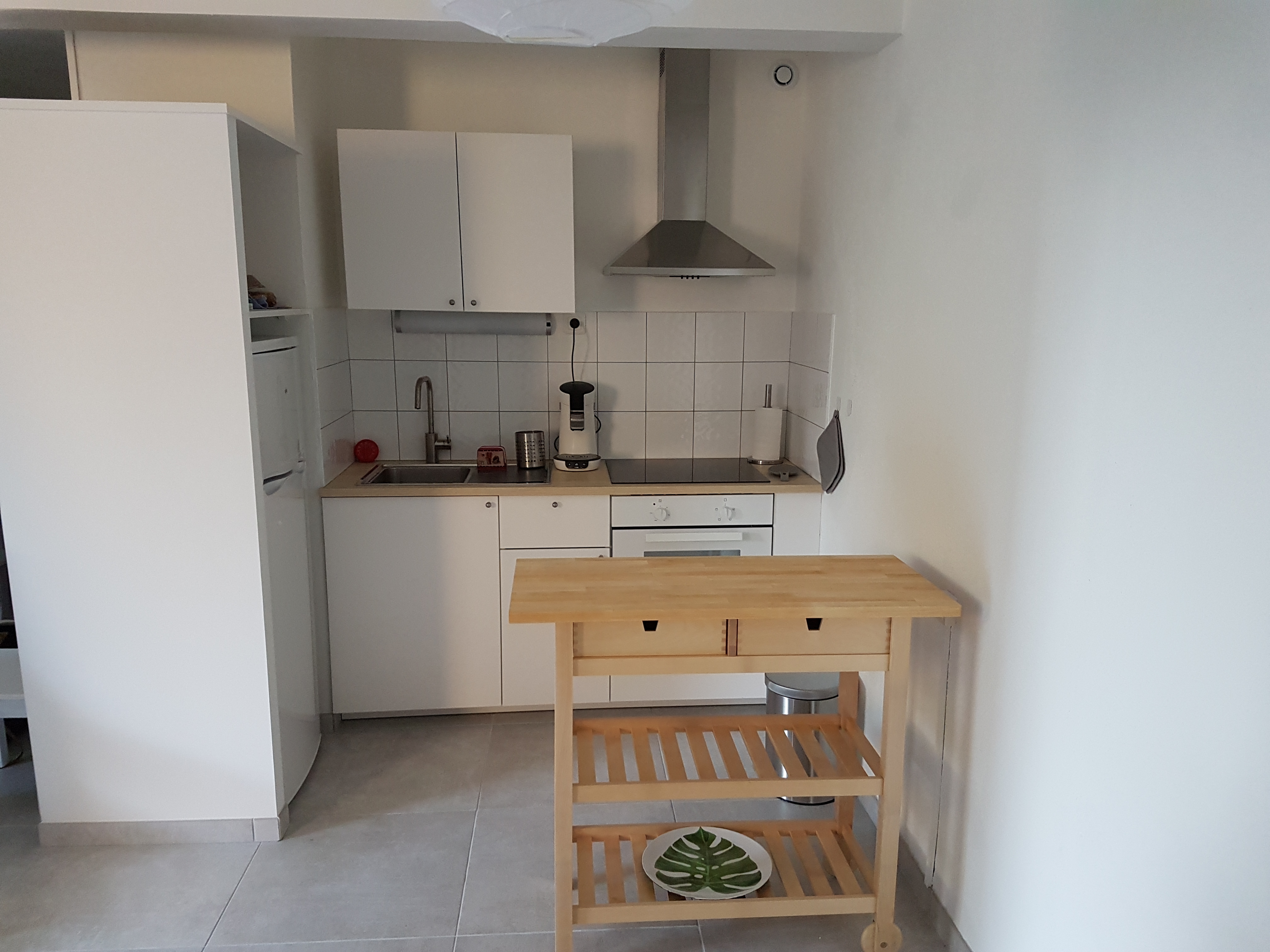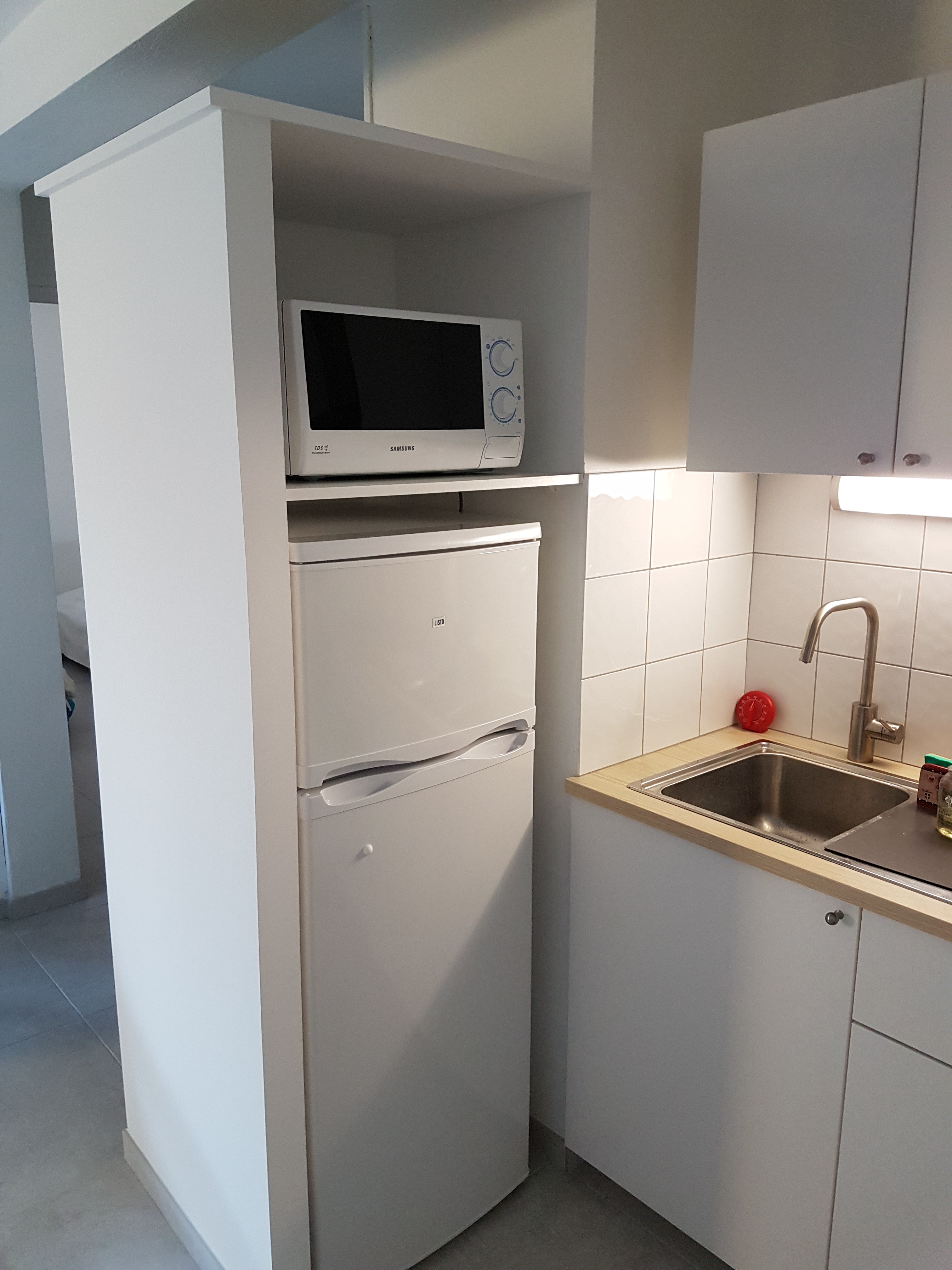 - La cuisine ouverte et conviviale avec comptoir de rangement pour la vaisselle est équipée d’une cuisinière électrique 4 feux, four, micro ondes, un réfrigérateur (avec compartiment 3*), d’une machine à café Senseo et d’un grille pain.